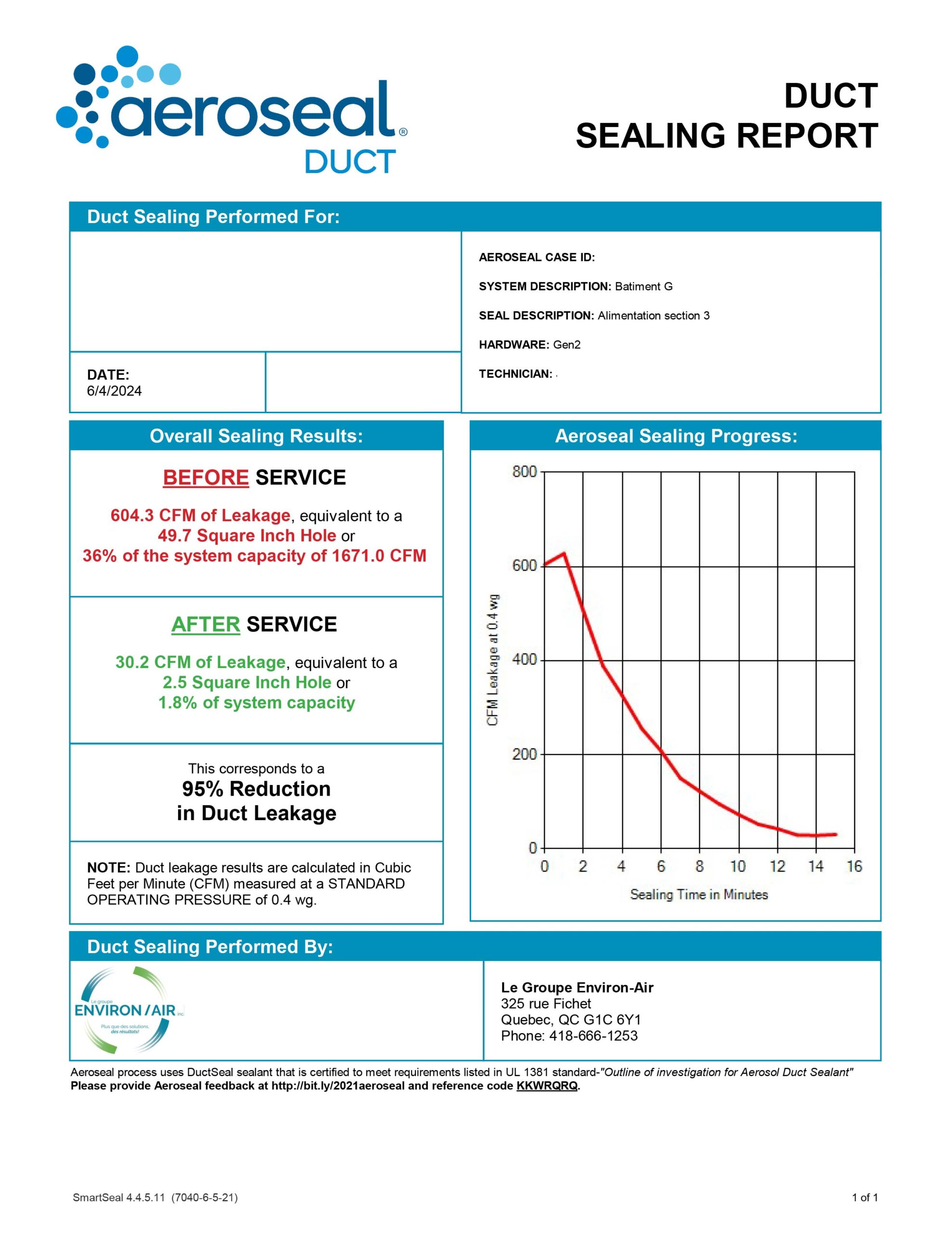 Le Groupe Environ-Air propose une solution révolutionnaire écoénergétique de scellement des conduits de ventilation. Elle est conçue pour améliorer l’efficacité énergétique, augmenter le confort des occupants et réduire les couts de fonctionnement de vos systèmes de ventilation, climatisation et chauffage dans les secteurs commercial, industriel, institutionnel, et hospitalier. Notre service d’étanchéisation utilise un procédé qui permet de sceller les fuites par l’intérieur des conduits par seulement un point d’injection sans même savoir où sont les fuites. Cette solution ne nécessite aucune intervention de démolition et est rapide, efficace et surtout garantie. Notre équipe effectue un essai d’étanchéité de votre réseau de conduits avant et après l’intervention afin de mesurer l’intervention et vous démontrez l’efficacité du processus Aeroseal.